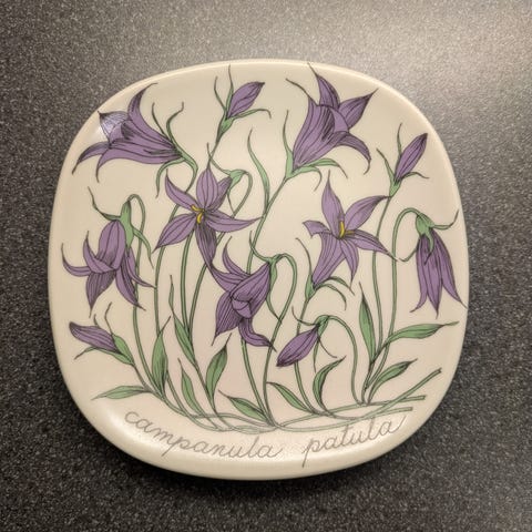 Arabia Harakankello seinälautanen / koristelautanen, suunnittelija Esteri Tomula. Halkaisija 12 cm – 12 ½ cm. Hinta 29 euroa.