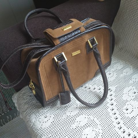 Käsilaukku, jossa vetoketju suulla, edessä vetoketju tasku, säädettävä olka hihna, koko 30x29cm.