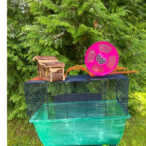 Iäkäs, mutta edelleen toimiva, ehjä pieneläin/jyrsijänhäkki pyörivillä jaloilla.