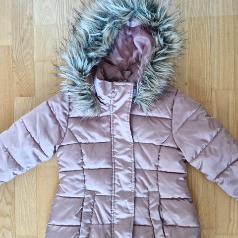 Pinkki toppatakki, ollut yhden talven käytössä. Hihansuuresorit leikattu irti. Kangas vettä hylkivä. Koko 104, pientä kokoa, ennemmin 98!