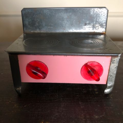 Vanha peltinen lasten leikkihella. Korkeus 8,5 cm, leveys 18 cm ja syvyys 10,5 cm. Postitus onnistuu.
