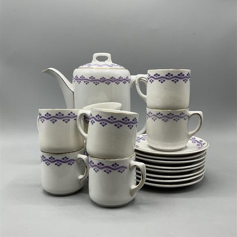 Saksalainen (DDR) kahviastiasto 1980-luvulta. Siisti ja hyväkuntoinen kultaukset mukaanlukien, vähäisiä käytönjälkiä löytyy eli muutamissa lautasissa on pieniä hiusnaarmuja lasitteessa.