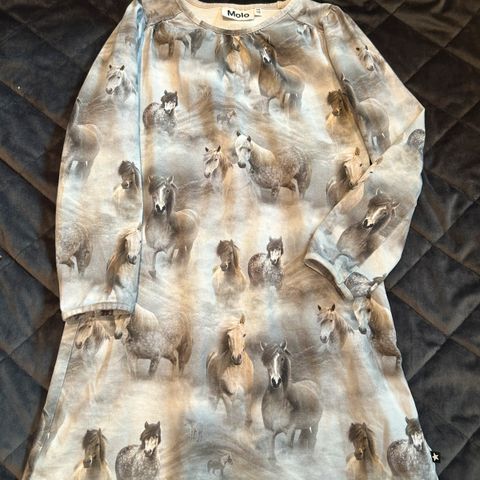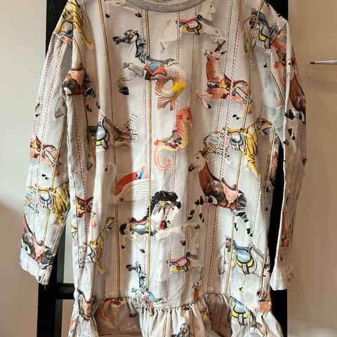 Myydään kuvanmukainen trikoomekko. Joitain haaleita jälkiä toppiosassa, näkyy kuvassa. Molo. Koko 122-128 cm. Hinta 12 e.