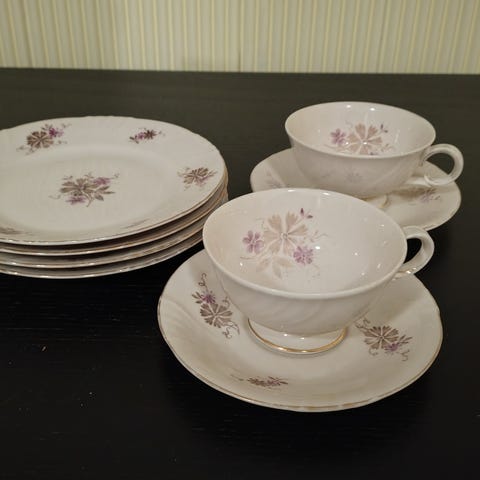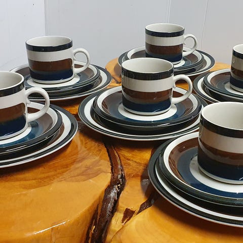 Laatikollinen kaira kahvikuppeja, kahvikupin alusia ja leipälautasia.