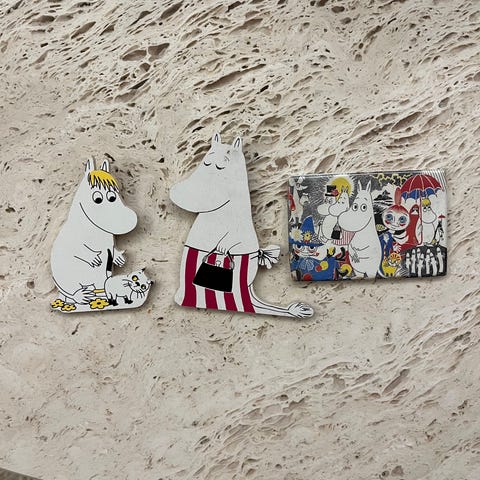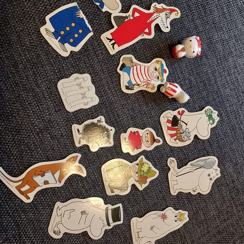 Muumi magneetit sekä Askartele huopatauluja -askartelusetti ovat uusia, mutta huopataulu setin pakkaus on hiukan kärsinyt säilytyksessä. Muumipeikko ja Niiskuneiti magneetit ovat 13 cm korkeita, muut sitä pienempiä ja pakkauksessa on yhteensä 19 magneettia. Setit yhteishintaan 10e.