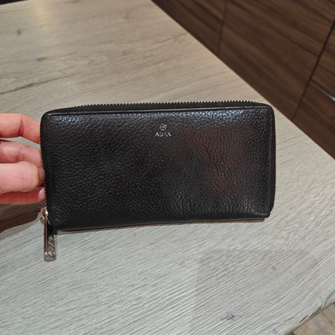 Uusi käyttämätön Adaxin nahkalompakko paksua mustaa nahkaa. Sisällä ruudullinen musta/beige-kangas. Koko 19x10. Nouto Käpylä, käteinen.