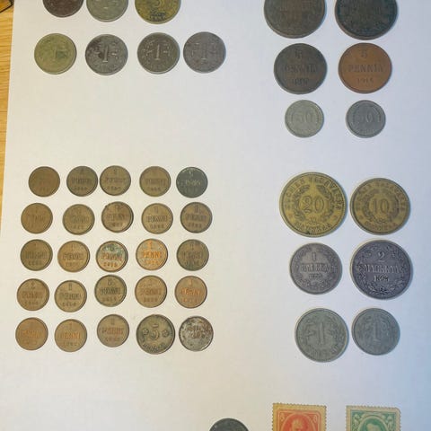 Vanhoja kolikoita ja seteli