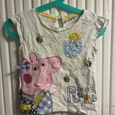 1. Pipsa possu; paljon käytetty, mutta yleisilmeeltään siisti. Paidan koko on 98 cm, mutta ottaisin paidan käyttöön jo koossa 86-92. Paidan kuvan printti on lukuisista pesukerroista huolimatta tosi hyvässä kunnossa. Sen sijaan paidan molemmista hihansuista olen ommellut minireiät piiloon, joten tästä syystä paidan kunto on kohtalainen, ei hyvä. Käyttökelvoton se ei mielestäni kuitenkaan vielä ole.