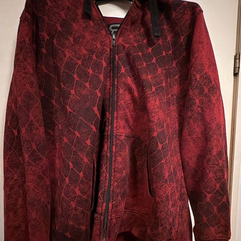Black Premium EMP punainen pitkähihainen paita mustalla ruusuprintillä, sama kuvio selkäpuolella. 3XL. Helmassa leveä resori. 95% viskoosia, 5% elastaania. Malli kuten kuvassa 3.