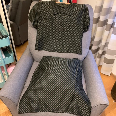 Myydään 60/70 luvulta oleva Elgee of London merkkinen jakkupuku. Koko on XS tai S. Jakkutakin kauluksessa ja napeissa samettia. Takista puuttuu ylin nappi, mutta se voi olla poistettu myös tarkoituksella. Takin leveys kainalosta kainaloon 45cm, hartiasaumasta-hartiasaumaan 37cm, pituus n.61 cm, hiha n. 60cm hartiasta. Hameen pituus 56cm, vyötärö n.32cm, helma 63cm.