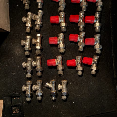 6kpl 15mm ja 6kpl 10mm keltaiset hatut MMA. Punaiset Danfoss 10mm 9kpl. Mukana välikappaleet ja pari termostaattia. Kuvan osat pakettina tai erikseen. Uudet osat mitä on jäänyt yli. Säilytetty sisätilassa.