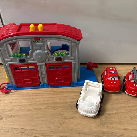Palo-auto ja 2 kpl Fisher Price little people hahmoa saatavilla.