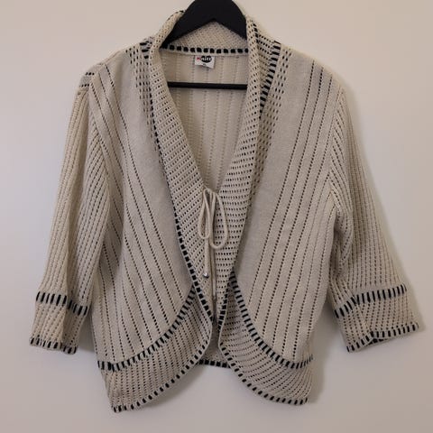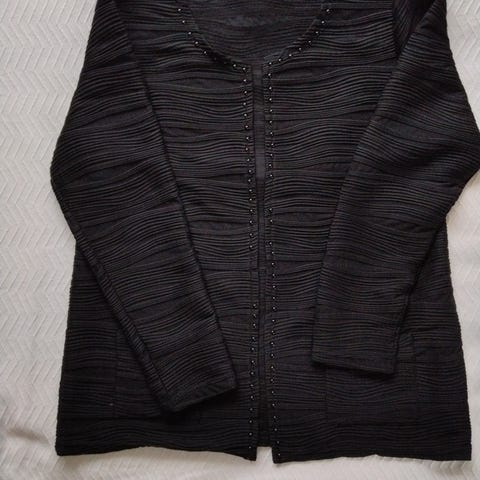Kuvan mukainen. Kaunis malli ja sopii monen kokoiselle, kun on ns kietaisu malli. etuosa on kaunista, näyttää melkein mokka nahalta. vaikka on tekokuitua. lämmin ja pehmeä. olen itse pitänyt vain hakaneulan avulla kiinni.