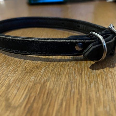 Pinkki nahkainen panta pienelle koiralle.