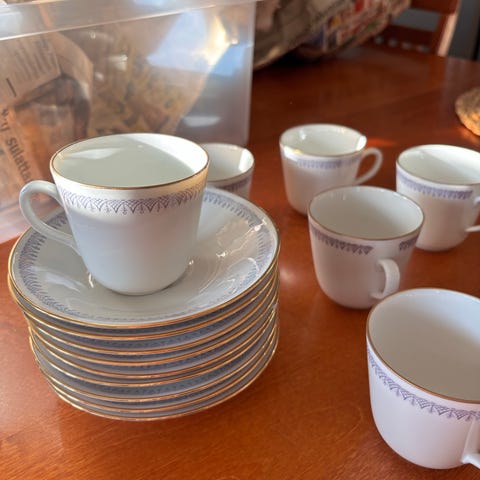 Ruotsalaisen Rörstrandin kuuluisaa Swedish Grace -astiasarjaa olevat kultareunaiset kahvi- ja teekupit. Molempia esim. 6 kpl tasseineen sekä pullalautaset.