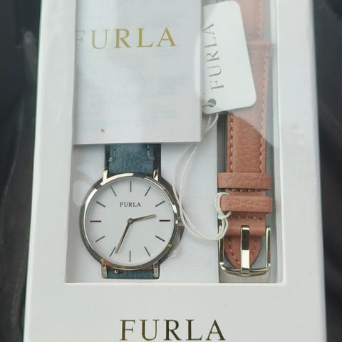 Furla rannekello tummanvioletilla kellotaululla. Teräsranneke, mukaan 5 jatkopalaa. Käytössä tullutta hiusnaarmua rannekkeessa ja taustassa isompi naarmu. Vaatii pariston vaihdon.