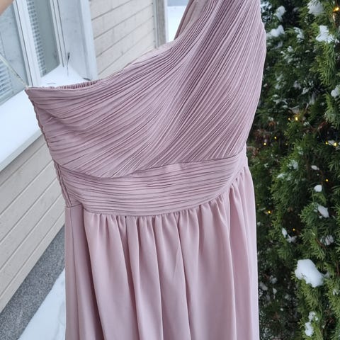 Kerran käytetty, pesty, morsiusneidon mekko. Kangas on harsomaista puuvilla-pellavasekoitetta. Sopii henkilölle, jonka rinnanympärys on max. 80 cm. Helman pituus 66 cm. Mekkoon kuuluu irtonainen solmittava vyö.