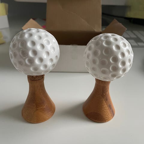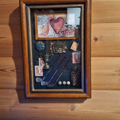 Sisustusesine, voi ripustaa tauluksi seinälle. Pelaajahahmo, kaksi palloa, putterin pienoismalli jne.