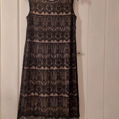 B. Young- merkin tummansininen hihaton pitsinen juhlamekko koko 38/ M. Pituus olalta helmaan n. 91 cm. Vetoketju sivulla helpottamassa pukemista. Istuu ja laskeutuu kauniisti. Vuori samaa väriä kuin pitsiosa. Ei ole ollut käytössä kertaakaan.