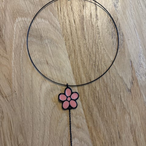 Kullanvärinen (ei arvometallia) kukkakoristeinen kaulakoru. Pituus säädettävissä 40,5-45,5 cm. Kyllanvärisiä lasikiviä koristeena.