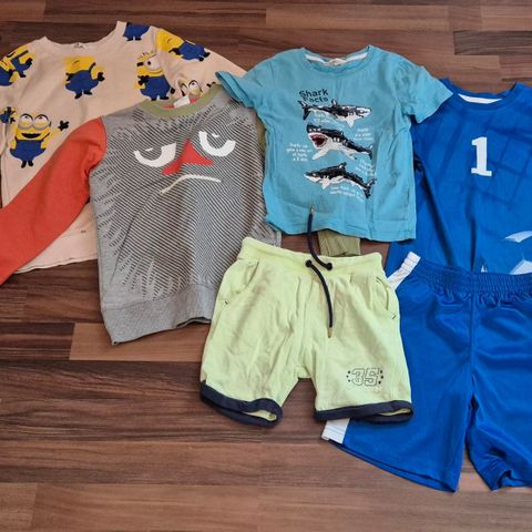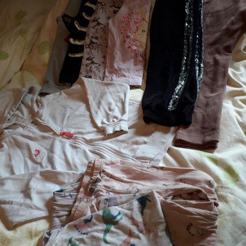 2 puseroa, kahdet sortsit ja 3/4 housut, pupu tunika, 2 farkkuhametta, hattu, Elsa verkkarit, muumihousut ja pallolliset 3/4 housut
