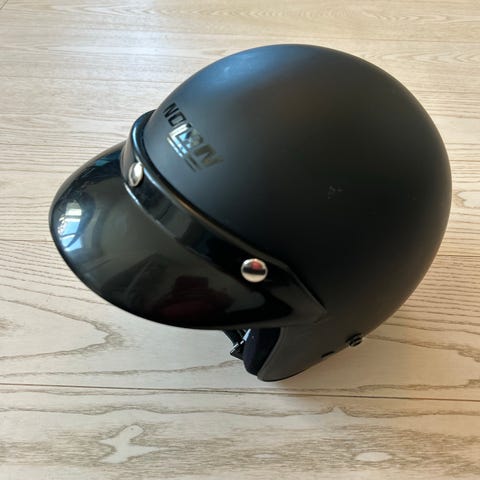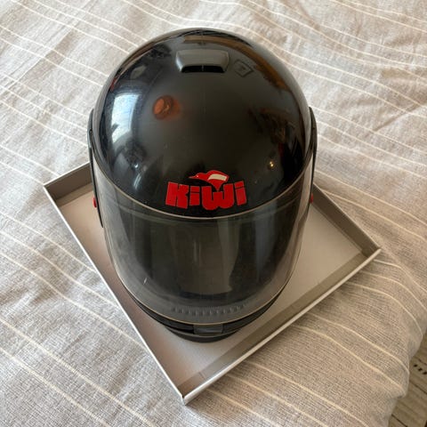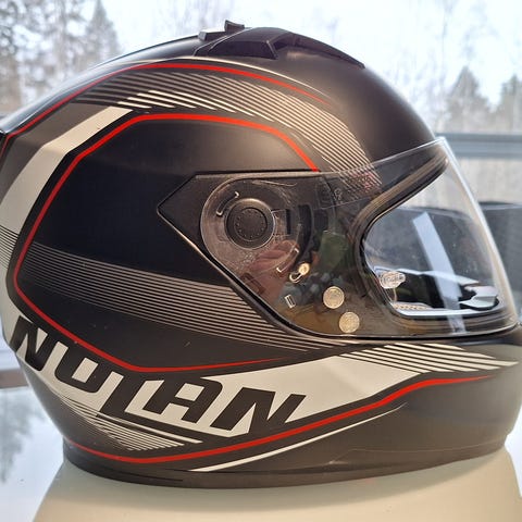 Punainen vintage moottoripyöräkypärä ( Nolan N32 ) Koko 58. En tiedä lieneekö vintage kypärää paljon käytetty, mutta vuosien säilytyksessä on ainakin saanut naarmuja pintaan. Koristeeksi ainakin soveltuu erinomaisesti. Leukahihnat vaativat kunnostamista, mikäli kypärä kuitenkin tulee käyttöön. Ikäänsä nähden kuitenkin hyväkuntoinen.
