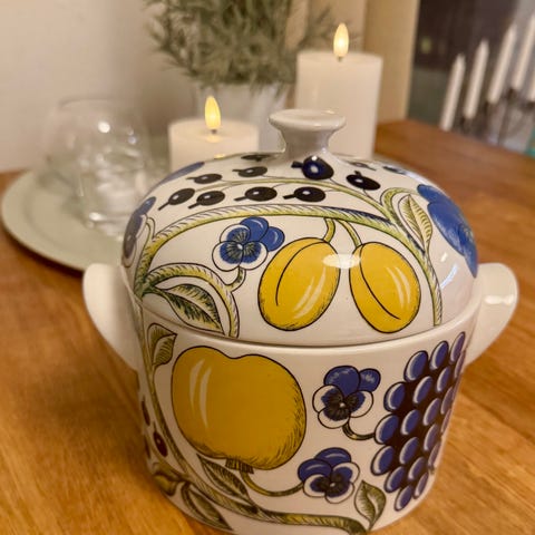Hakusanat: Arabia tarjoiluastia, Paratiisi, Birger Kaipiainen, soppaskooli, liemikulho, terriini, tarjoiluastia, 70-luku, finnish design, alkuperäinen Paratiisi-sarja, Paratiisi wärtsilä, juhlakattaus, arabia,
