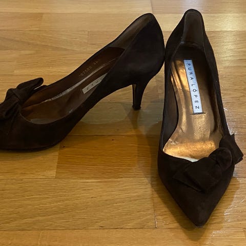 Tumman ruskeat mokkanahkaiset avokkaat, joiden päkiän alla kuminen puolipohja, kts. kuvat, muutoin pohja nahkaa, kenkien sisäpohja ja vuori myös nahkaa. Kengät jääneet lähes käyttämättä, koko 38,5. Koron korkeus 8cm takaa mitattuna.