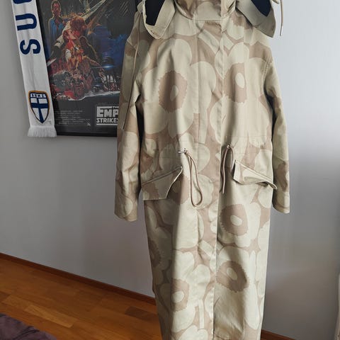 Uudenveroinen Marimekko Arteesi Unikko trenssi koko , kai-kai 57, pituus 80, näppi kiinnitys, sivutaskut.