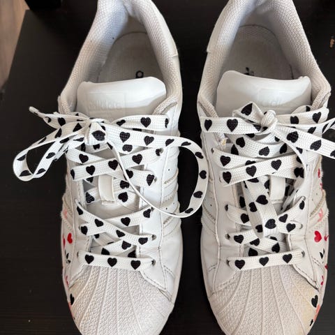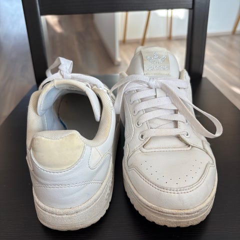 Hyväkuntoiset Adidaksen kerman ja vaaleansinisen väriset korkeavartiset tennarit koko 37,5. Kunto näkyy kuvista. Vikassa kuvassa näkyy pieni sisävuoren värjäymä joka tullut säilytyksessä.