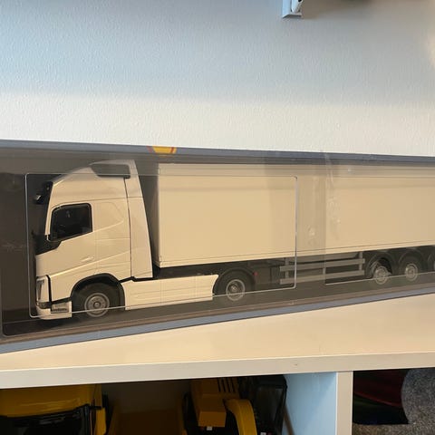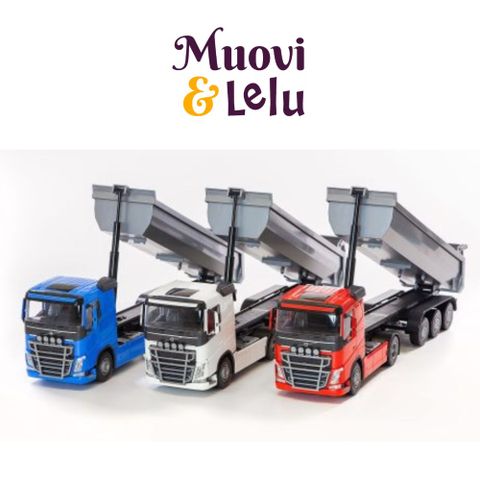 Volvo FH16 hiekkarekan autossa ja peräkärryssä on kippitoiminto sekä avattava perälauta. Autossa on lisäksi takapyöräjousitus ja peilisarja. Värilajitelma; k.sin., pun., valk. Tuotteen koko 62 cm, ikkunapakkaus. Mittakaava 1:25. Ikäsuositus 3+.
