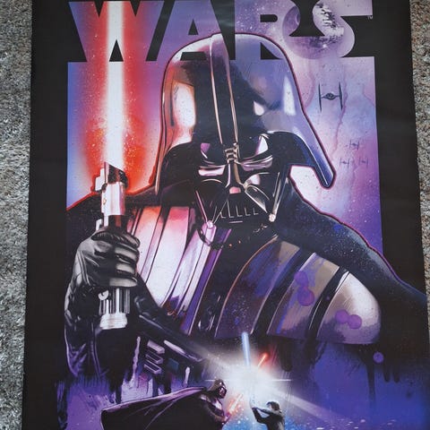 N. 240 x 150 cm kokoinen komea Star Wars juliste / mainos, joka aikoinaan roikkunut Vaasan Ritz-leffateatterissa. Kunnoksi laitoin kohtalaisen eli ehjä on, mutta löytyy mm. 4 liimajälkeä teipistä jotka näyttäisi kyllä lähtevän irti helposti pienellä hinkkauksella.
