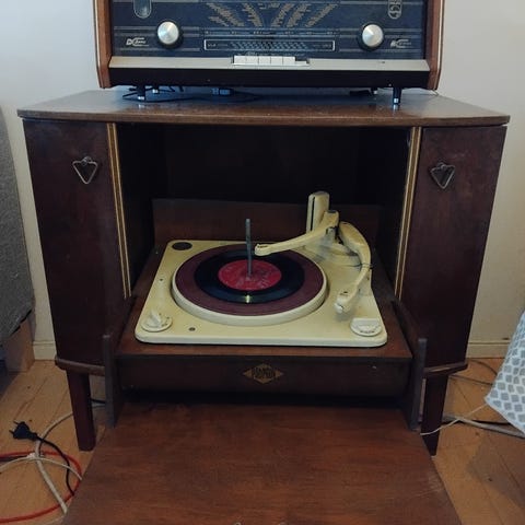 Vanha radio-levysoitin. Isokokoinen leveys 82 x korkeus 28 ja syvyys 32 cm.