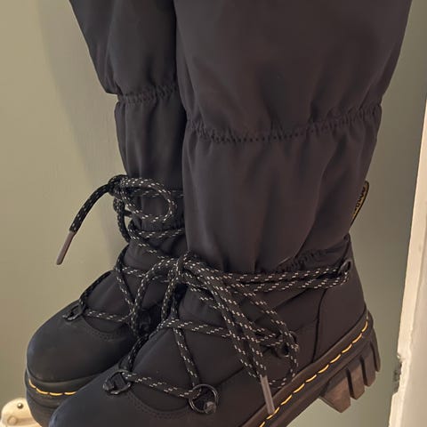 Myynnissä viime vuoden loppupuolella ostetut lämpimät Dr. Martensin kengät karvavuorella. Kengissä vetoketju. Kaupassa kengät tuntuivat sopivilta, mutta käytössä totesin hyvin nopeasti niiden olevan hieman liian isot. Kengillä on käyty vain pari kertaa oman takapihan terassilla ja ne jalassa on tehty yhdet ruokaostokset, silloinkin matka tehty autolla ja kengillä kävelty vain sisätiloissa. Kenkien pinnassa näkyi parissa kohdassa ihan pientä likaa (pölyä tms.), yritän poistaa ne ennen lähetystä. Lisäksi kenkien pohjassa näkyy ihan pientä jälkeä, joka näkyy tarkemmin viimeisessä kuvassa. Mitään käyttöön vaikuttavaa vikaa tai suurempaa ulkonäköön vaikuttavaa mainittavaa kengissä ei ole ja käyttöikää on jäljellä kuin uusilla!