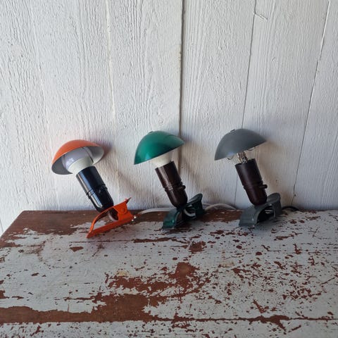 Vanhat retro kattovalaisimet. Kohtuu siistit ja ja toimivat. Toki pikkuisen elämän jälkeä ja patinaa löytyy. Toisessa keltaisessa musta osa saanut joskus lämpöä ja sisäpanta ei mene paikalleen, ei ulkopuolelta huomaa, mutta joutuu asettelemaan tarkemmin että saa suoraan.