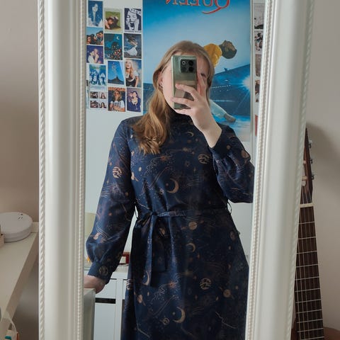 Siisti mekko. Kevyttä kangasta, takana narut. Pituus noin puoleen sääreen. Postitus normipostilla tai haku.