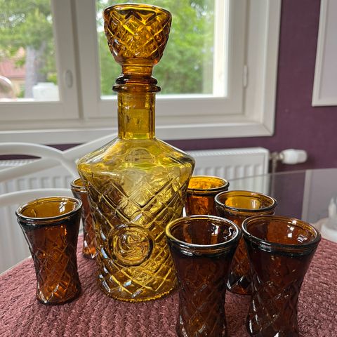 Lasinen pieni karahvi, koko: k20cm, l10cm ja 6kpl pienet lasit, koko: k10,5cm, l4,5cm. Ehjät