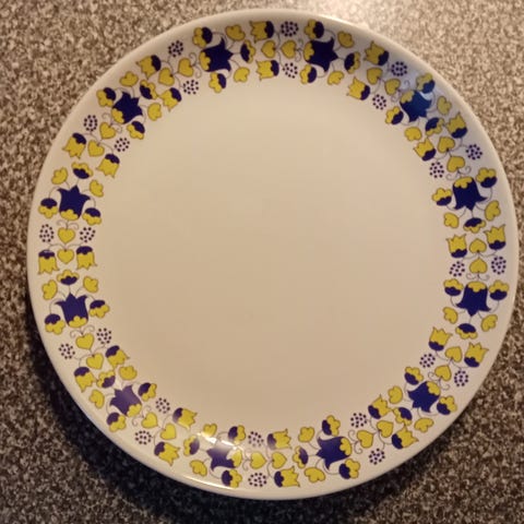Vintagelautanen 1970- luvulta. Halkaisija 33 cm. Suunnittelija G. O-G, käsinmaalattu. Voidaan toimittaa lähialueelle (Lpr-Simpele) myyjän aikataululla.