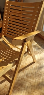 Niko Kralj, tuoli/taittotuoli, malli 'Rex', puuta, suunniteltu 1956. Viilutettu tuoli, kokoontaitettava runko käsinojilla, selkänoja vaakasuoralla syvennyksellä, k.73cm, istuinkorkeus: 38cm, leveys.56cm, s.70cm. Tuoli löytyy NYC MoMasta, muodosta on tykätty siellä ja täällä. Tuoli ollut varastossa, joskus aikoinaan istuttu, joten kunto erinomainen.