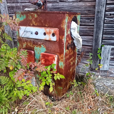 Käytöstä poistettu öljysäiliö. Vuotosäiliössä irrotuksessa tullut reikä. Sisältää vähän öljyä.