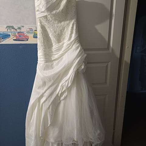 Kaunis yksiolkaiminen, ammattiompelijalla aikoinaan teetetty mekko. Keltainen nauha (kts.kuvat 1. ja 3.) poistettu eli kokovalkoinen.