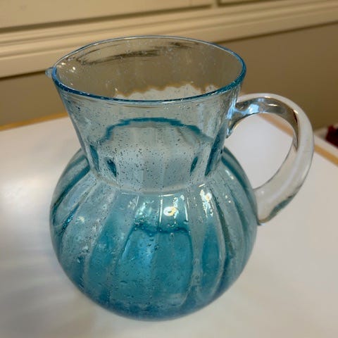 Myydään lähes käyttämätön Pentikiltä aikanaan hankittu kaunis lasinen kannu pienellä kaatonokalla ja lasikorkilla.