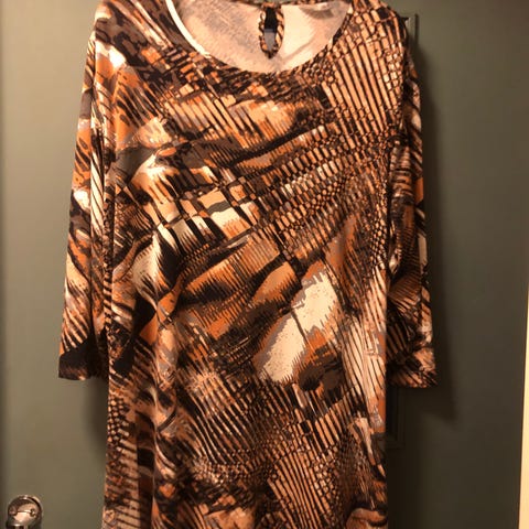 Siisti musta tunika arkeen ja juhlaan. Lyhyet läpikuultavat hihat. Pusero-osassa kaksi ohutta kangasta päällekkäin. Päällimmäisessä edessä pitsikoristeet. Kangas läpikuultavaa, kun katsoo valoa vasten. Ei kuulla läpi, kun vaate on päällä. Helppohoitoinen kangas. Koko- ja materiaalilaput leikattu pois. Vastaa kokoa 48/50. Kk 65cm, pituus 90cm.