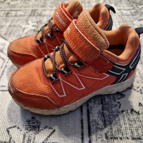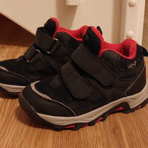Warpin mustat välikausikengät, joissa jonkinlainen karvavuori. Kokomerkintä 25. Käytönjälkeä on, eikä ole erityisesti putsattu, mutta vielä toimivat seuraavalle.