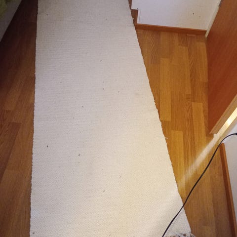 Hyvännäköinen musta valkoinen pallomatto. Yhdessä pallossa näkyy olevan likaa, lähtee varmaankin pesulla. Oisko Ikean matto?