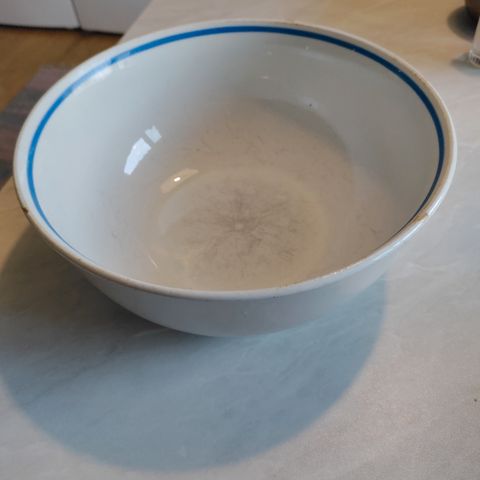 Myydään käytössä ollut Arabian Siniraita kulho. Halkaisija 20cm, korkeus 9cm. Reunassa muutama jälki, joista kuvat.