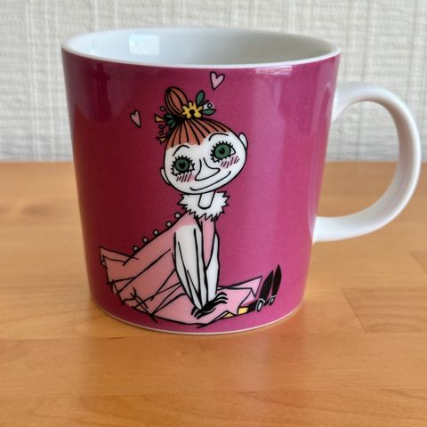 Tumman roosan värisessä mukissa kuvataan maassa istuva Mymmeli, joka hymyilee lempeästi katsojalle.