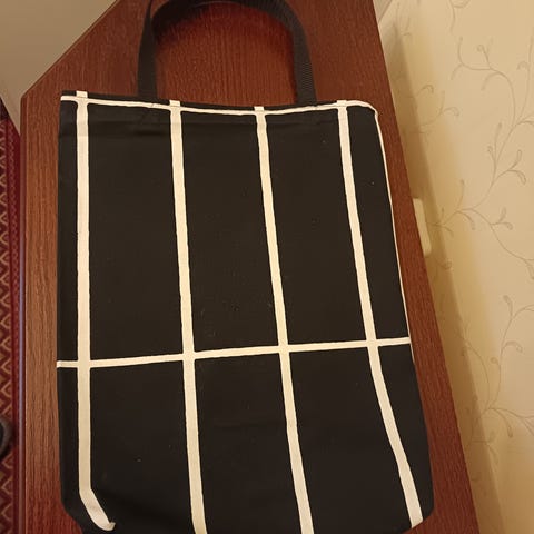 Marimekon Tiiliskivi kankaasta ommeltu kassi. Koko 44 x 37 cm. Puuvillaa. Voin lähettää. Mmm.