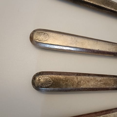 Hienot Musla-kuvioiset veitset, ( 21cm) ja haarukat, (18cm) 5+5 kpl, materiaalista en tiedä, mutta luultavasti terästä ? Lautasliinarenkaat, jotka ovat kuvassa, ei kuulu kauppaan.