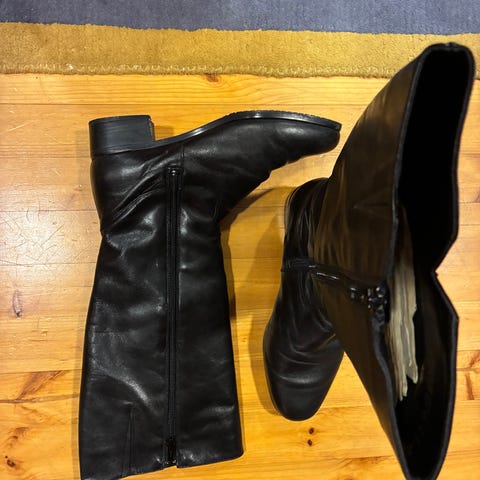 Nahkaiset saappaat joissa venyke takaosassa. Kapea malli. Varsi pohjasta yläosaan 55cm ja venykeosa 50cm korkea. Varren ympärys n.40cm. Huopapohjalliset. Pidetty vain pari kertaa. Siistit ja ehjät. Lähetys onnistuu postikuluja vastaan.